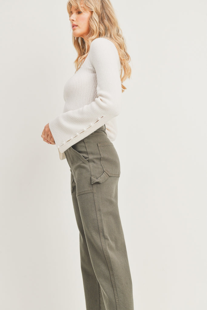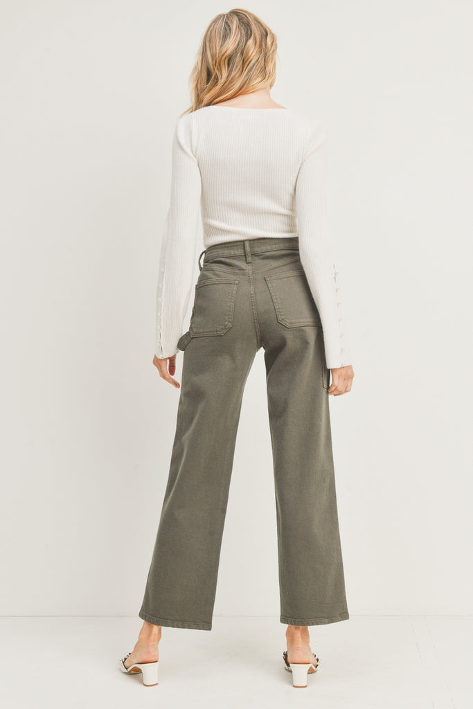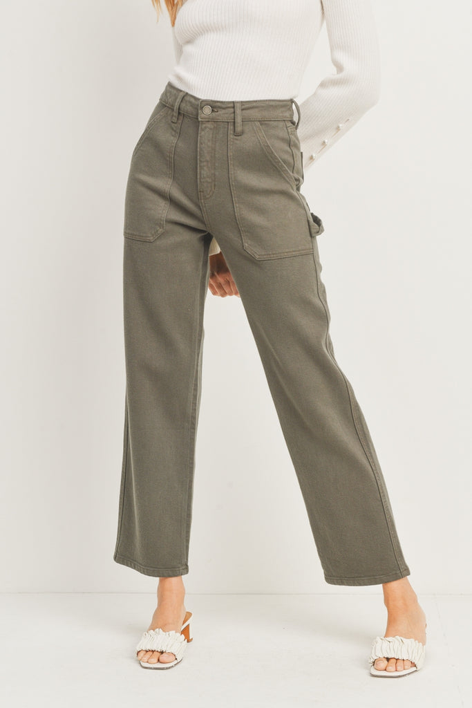 Rue Carpenter Jean Our baggy carpenter jeans are fitted through the high waist with slouchy straight legs. This classic relaxed fit will keep you moving with ease throughout the day. 12" Rise, 30" Inseam, 9.5" Opening Dark Olive - Carpenter Jean